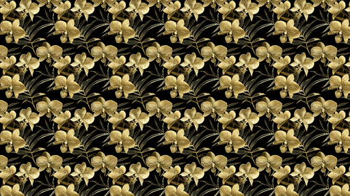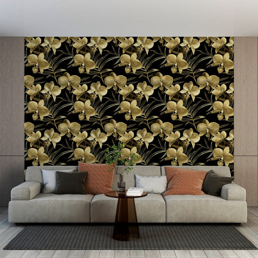 WonderMuralOplev vores fascinerende Fototapet med et mønster af gyldne orkideer, der blomstrer mod en dyb sort baggrund. Hver blomst er omhyggeligt tegnet for...