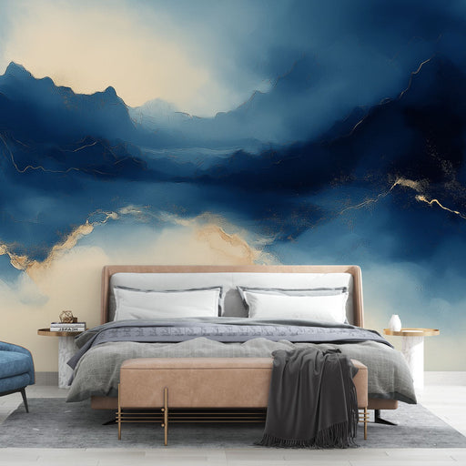 WonderMuralTransformér dit rum med vores abstrakte mønstrede fototapet, der skildrer et bjerglandskab indhyllet i tåge. Nuancerne af dyb blå blander sig delik...