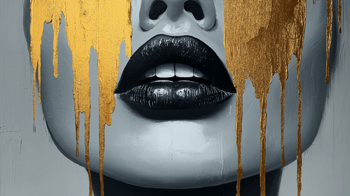 WonderMuralDette fængslende tapetmaleri har et stiliseret ansigt med mørke træk, accentueret af lyse guld detaljer, der drypper ned. De fyldige læber og kontr...