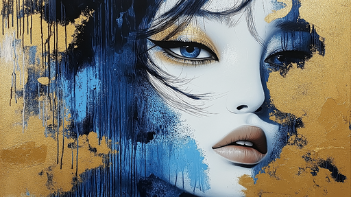 Se fulde detaljerTapet kunstnerisk ansigt | Portræt i nutidig stil med nuancer af blå og gyldne strejf