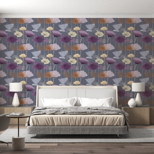 WonderMuralOplev vores Fototapet med farverige blomstmotiver, der blander nuancer af lilla, fløde og orange på en beroligende grå baggrund. Dette moderne og e...