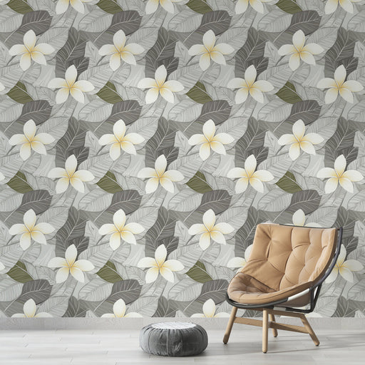 WonderMuralDenne tapet har et delikat mønster af hvide blomster med bløde kronblade, omgivet af blade i nuancer af grå og grøn. Farveharmonien skaber en atmos...