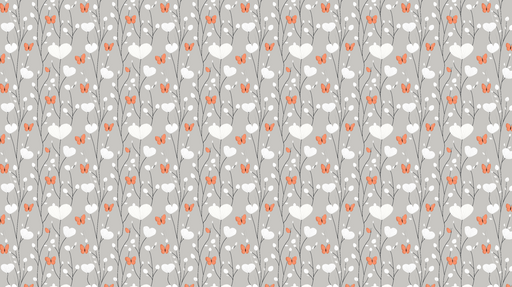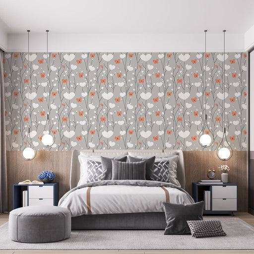WonderMuralVores fototapet vækker minder om en mild forårstur med sine delikate mønstre af hvide blomster og orange sommerfugle på en beroligende grå baggrund...