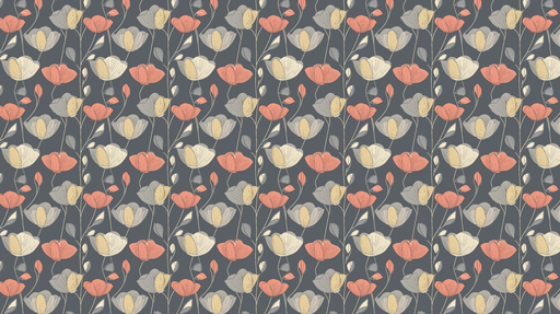 WonderMuralVores eksklusive Fototapet viser et smukt mønster af delikate blomster i bløde nuancer af pink, fløde og gul, harmonisk arrangeret på en dyb grå b...