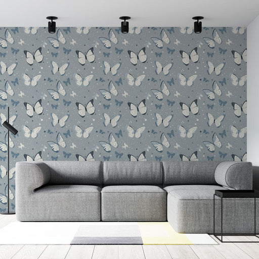 WonderMuralVores fototapet har et elegant mønster af sommerfugle i delikate nuancer, der svæver på en blød grå baggrund. Hver sommerfugl, illustreret med stor...