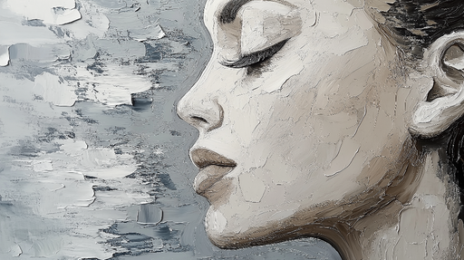 WonderMuralDette tapet fremhæver en fængslende kvindelig profil, skabt med rige teksturer og nuancer af grå og beige. Knivmalingsteknikken skaber en relief ef...