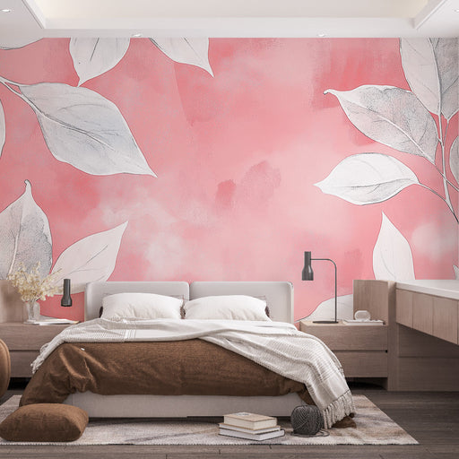 WonderMuralDette tapet har en delikat illustration, hvor hvide blade elegant skiller sig ud mod en pastelrosa baggrund. Dette design bringer et strejf af fris...