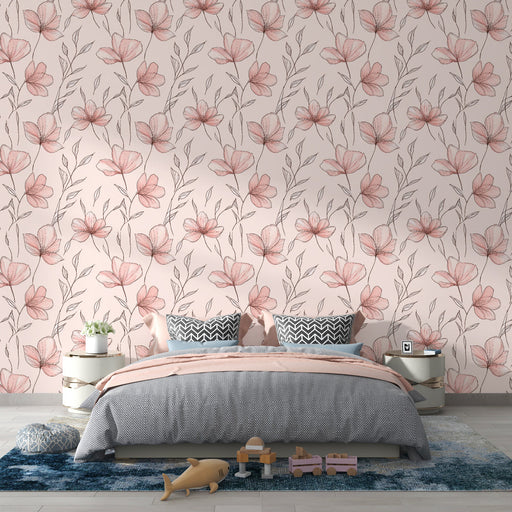 WonderMuralDenne tapet adskiller sig ved et blødt mønster af pink blomster og sorte stængler, der svajer på en cremefarvet baggrund. De subtile nuancer og del...