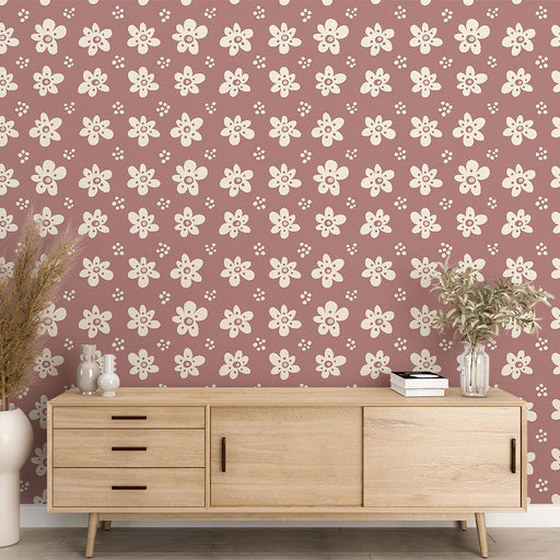 WonderMuralDette charmerende fototapet har et delikat mønster af hvide blomster på en blød lyserød baggrund, hvilket skaber en glad og forfriskende atmosfære....