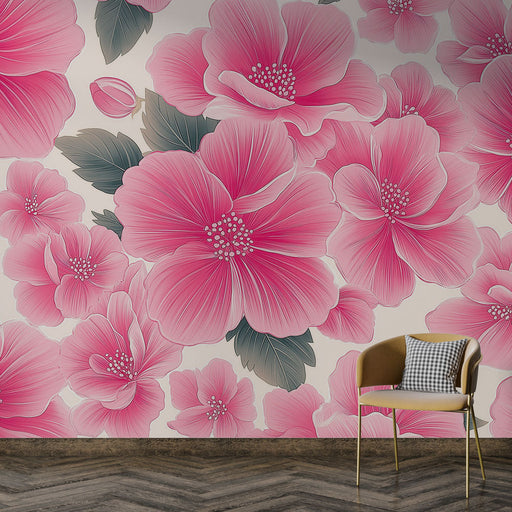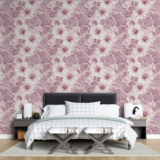 WonderMuralVores fantastiske fototapet fremkalder et charmerende motiv af pink blomster delikat skitseret, omgivet af subtilt løv på en blød pastelbaggrund. E...