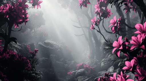 WonderMuralVores eksklusive fototapet har en mystisk skov scene, hvor livlige pink blomster kontrasterer smukt med et landskab af tåge og sten. Lysets stråler...