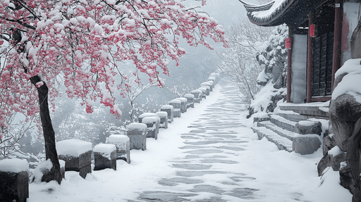 WonderMuralDette sublime fototapet fanger magien af et vinterlandskab, hvor en fredelig sti er foret med sten og et lyserødt blomstrende træ, indhyllet i sne....
