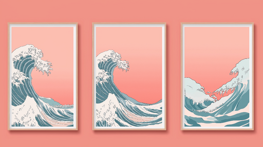 WonderMuralVores tapet har et smukt mønster af bølger inspireret af traditionel illustration, tilgængelig i tre harmoniske paneler på en blød lyserød baggrund...