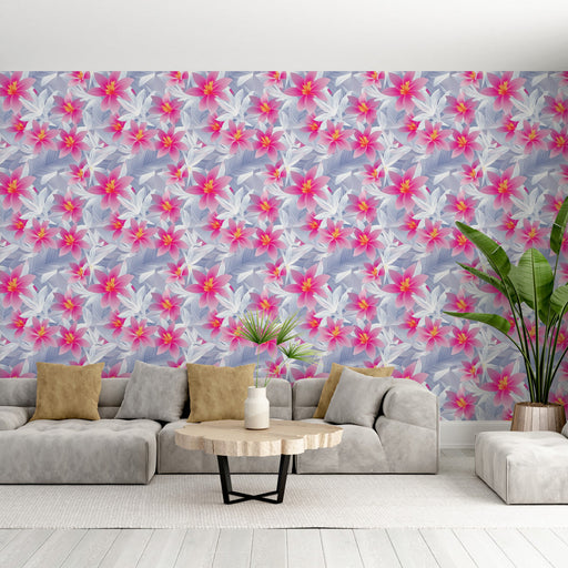 WonderMuralVores fantastiske Fototapet har et levende mønster af pink blomster kombineret med delikate blade på en levende blå baggrund. De dristige farver b...