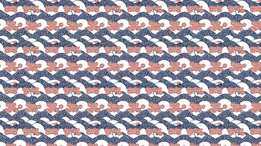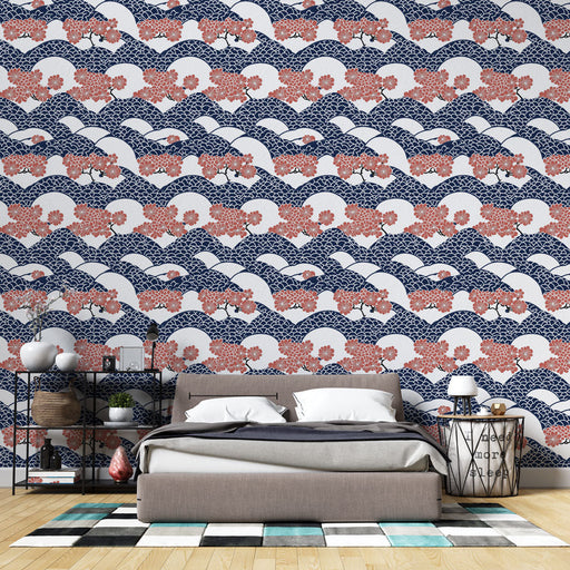 Se fulde detaljerBlomstret og bølget fototapet | Blå bølgemønstre med delikate lyserøde blomster