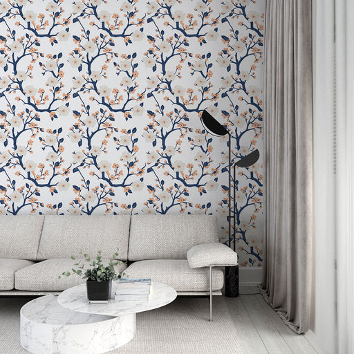 WonderMuralDette blomstermønstrede fototapet har et delikat mønster bestående af grene prydet med smukke hvide blomster og strejf af roser, hvilket skaber en ...