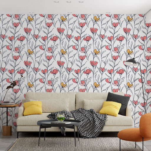 WonderMuralVores tapet har et lyst mønster af stiliserede blomster, i bløde nuancer af gul, pink og hvid. Blomsterne, tegnet med fine linjer, skaber en glad o...