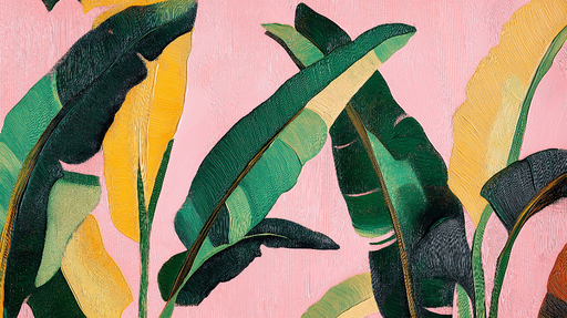 Se fulde detaljerFototapet banana leaf | Fine grønne og gule blade på lyserød baggrund