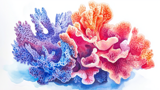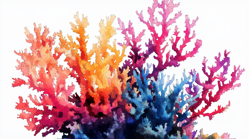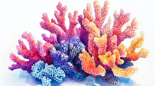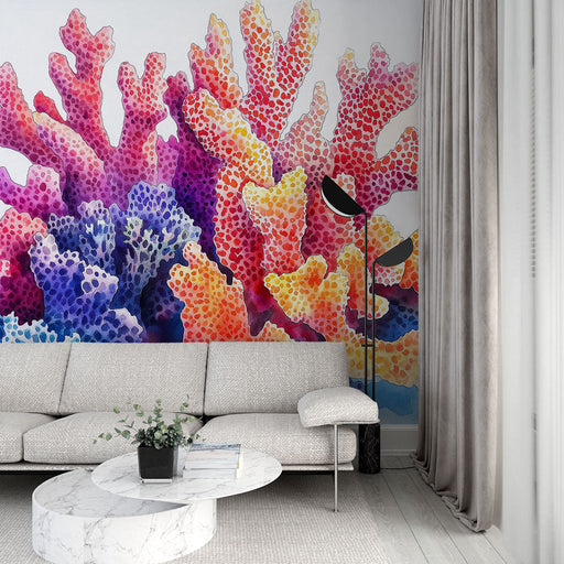 WonderMuralDette fængslende tapet viser en storslået akvarelillustration af farverige koraller, med livlige nuancer, der spænder fra pink, orange til dyb blå....