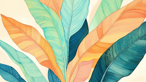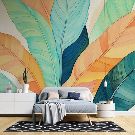 WonderMuralDette fototapet skiller sig ud med et storslået mønster af tropiske blade illustreret i levende nuancer af orange, turkis og grøn. De delikate linj...