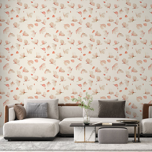WonderMuralDenne tapet har et smukt mønster af pink blomster og delikate blade malet i akvarel på en lys baggrund. De bløde nuancer af pink og den lette stil ...