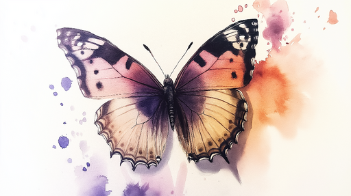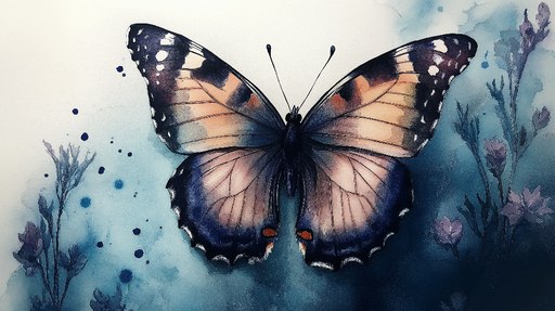WonderMuralDette tapetmaleri har en smuk akvarel sommerfugl med delikate vinger, der viser nuancer af blå, orange og mørkelilla, der skiller sig ud mod en ber...