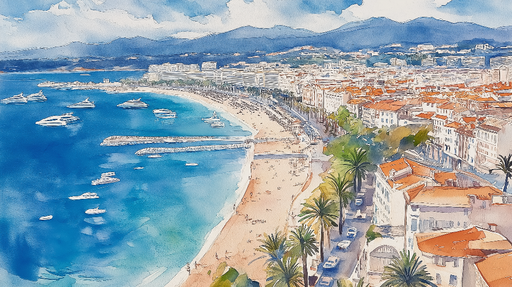 WonderMuralDyk ned i den solrige atmosfære på den franske Riviera med vores tapetmaleri, der illustrerer en pragtfuld panoramisk udsigt i akvarel. Dette desig...