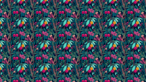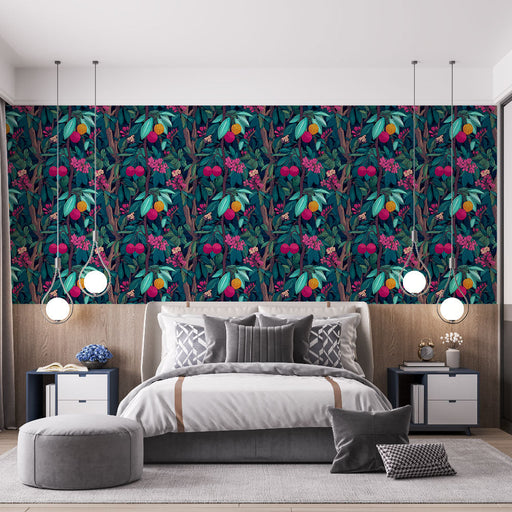 WonderMuralOplev vores eksotiske blomsterfototapet, der har et rigt og levende mønster af frugter og blomster på en mørk baggrund. De lyse nuancer af rød, gul...