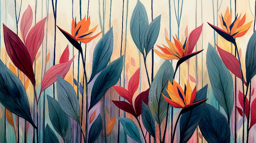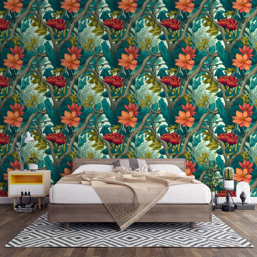 WonderMuralVores eksklusive Fototapet har et dristigt mønster af tropiske blomster, med livlige nuancer af rød, orange og grøn. De stiliserede og eksotiske bl...