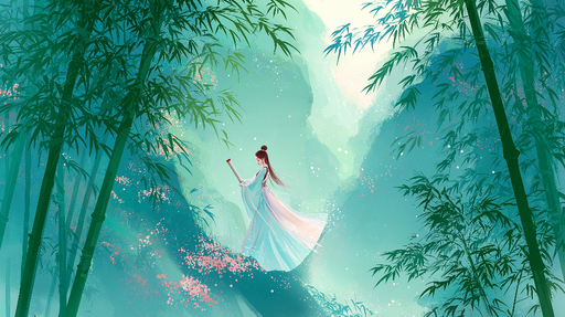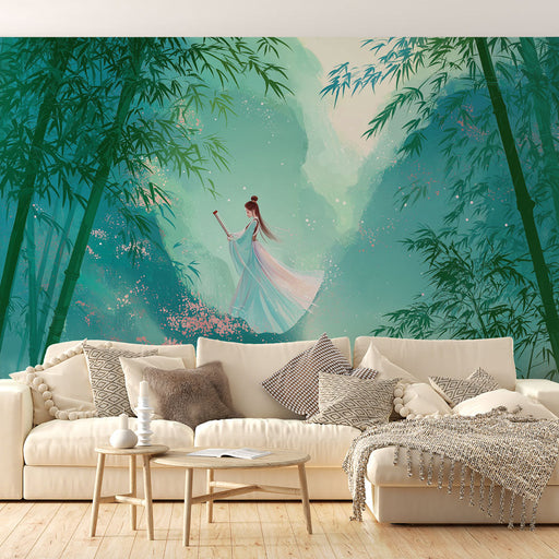 WonderMuralVores fantastiske fototapet har en drømmende scene, hvor en kvinde iført traditionelt tøj står majestætisk midt i en skov af lækker bambus. Den bl...