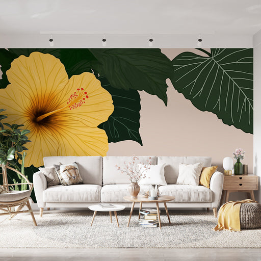 WonderMuralDette fototapet fremhæver en storslået gul hibiscusblomst, tegnet med delikate detaljer, der står i kontrast til mørkegrønne blade og skaber en tro...