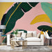 Dette fototapet fremhæver et vibrant design af tropiske blade, der blander nuancer af grøn, gul og blå på en blød pink baggrund. Teksturerne og de kunstneriske detaljer bringer denne fototapet til live, hvilket tilføjer et strejf af natur og friskhed til dit interiør.