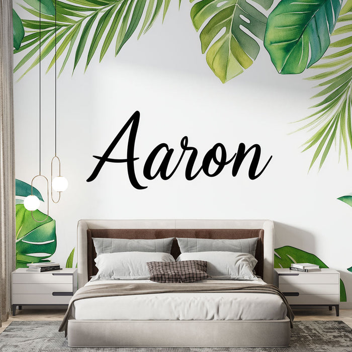 Denne fototapet har et elegant mønster af tropisk løv omkring navnet Aaron. Bladene i nuancer af grøn, der spænder fra lys til mørk, skaber en varm og forfriskende atmosfære, ideel til et børneværelse eller legeområde.