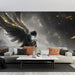 Dette fængslende fototapet viser en melankolsk engel med majestætiske sorte vinger, badet i en aura af gyldent lys. Kontrasten mellem de mørke nuancer og lyse højdepunkter skaber en atmosfære, der er både mystisk og beroligende, ideel til at tilføje et strejf af elegance til dit interiør.