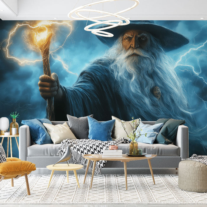 Dette fængslende fototapet illustrerer en majestætisk troldmand, der holder en flammende stav, omgivet af en dramatisk himmel fyldt med lyn. Nuancerne af dyb blå og lys orange fremhæver karakterens magiske kraft og skaber en mystisk og fortryllende atmosfære.