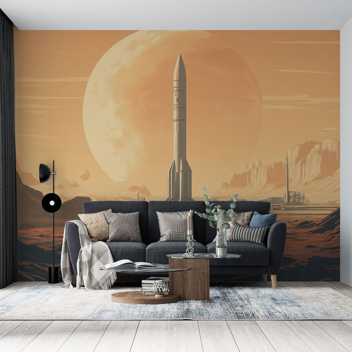 Dette fængslende fototapet har en futuristisk scene, hvor en majestætisk raket er klar til affyring fra en ørkenplanet. Det martianske landskab, farvet med okker og orange nuancer, fremkalder en atmosfære af eventyr og rumforskning, med en stor måne, der oplyser horisonten.
