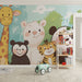 Dette tapetmaleri har en dejlig gruppe af jungle dyr, herunder en smilende giraf, en glad panda, en isbjørn, en drillende tiger og en lille sort bjørn. Karaktererne, med deres bløde træk og pastelfarver, skaber en legende og varm atmosfære, ideel til et børneværelse eller en legestue.