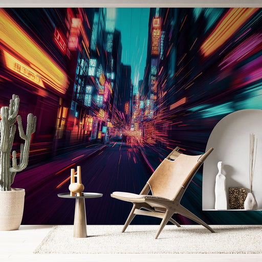 WonderMuralDiese Tapete beschwört eine dynamische nächtliche Stadt herauf, in der lebendige Neons eine lebhafte Straße erleuchten. Die Blautöne, Rot- und Oran...