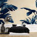 Diese Tapete bietet einen eleganten Kontrast zwischen einem sanften Beige und tropischen Blattmustern in tiefem Blau. Die großen, künstlerisch gezeichneten Blätter schaffen eine Atmosphäre, die sowohl natürlich als auch chic ist, ideal, um Ihrem Interieur einen Hauch von Exotik zu verleihen.
