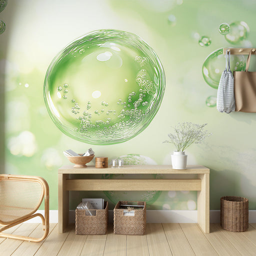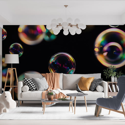 WonderMuralEntdecken Sie unsere faszinierende Tapete mit schimmernden Seifenblasen, die in der Luft schweben. Jede Blase ist mit mehrfarbigen Reflexionen verz...
