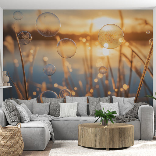 WonderMuralUnsere fesselnde Tapete zeigt ein prächtiges Muster von Blasen, die zart über goldenen Gräsern schweben, gebadet in warmem Herbstlicht. Die transpa...