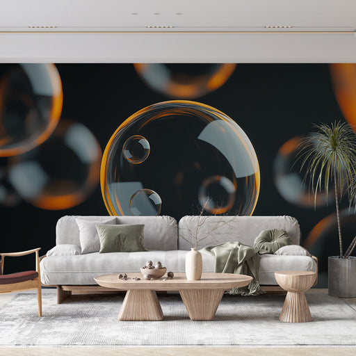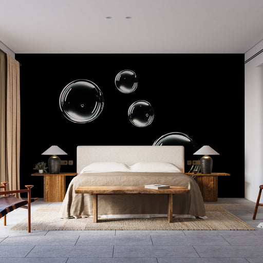 WonderMuralEntdecken Sie unsere faszinierende Tapete mit Wasserblasen, die auf einem schwarzen Hintergrund schweben und eine moderne und beruhigende Atmosphär...