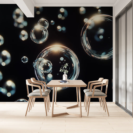WonderMuralEntdecken Sie unsere prächtige Tapete mit glänzenden Wasserblasen, die auf einem schwarzen Hintergrund schwimmen und einen faszinierenden und zeitg...