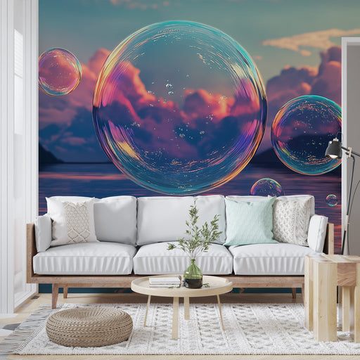 WonderMuralUnsere Wandtapete zeigt ein faszinierendes Muster von Seifenblasen, die in einem ätherischen Raum schweben, gefüllt mit Pastellfarben und schillern...