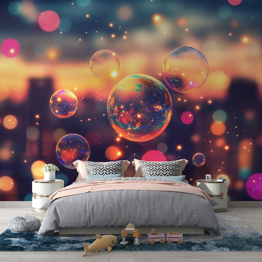WonderMuralDiese Fototapete zeigt ein surreales Design mit vielfarbigen Blasen, die auf einem verschwommenen Hintergrund schweben und eine magische und traumh...