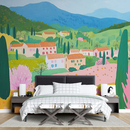 WonderMuralDiese Wandtapete zeigt eine herrliche Landschaft auf dem Land mit pastellfarbenen Dörfern, die von grünen Hügeln und blühenden Feldern umgeben sind...