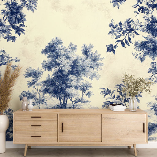 WonderMuralUnsere Wandtapete zeigt ein elegantes Landschaftsmuster, das in Schattierungen von Indigo auf einem cremeweißen Hintergrund illustriert ist und die...