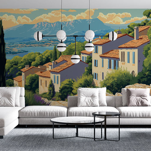 WonderMuralDiese lebendige Tapete zeigt ein mittelmeerisches Dorf mit seinen typischen Häusern, die mit bunten Fensterläden verziert sind und von üppiger Vege...