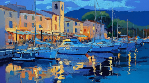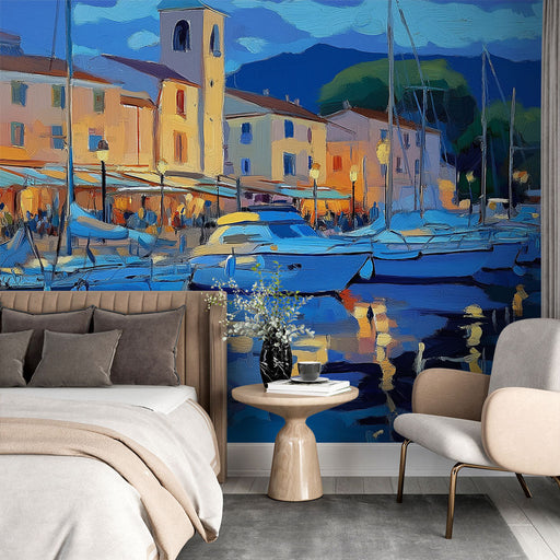 WonderMuralDiese Tapete zeigt eine lebendige nächtliche Szene eines Mittelmeerhafens, mit eleganten Booten, die entlang der Kais vertäut sind, unter einem tie...