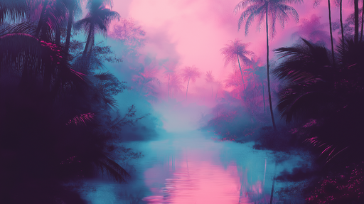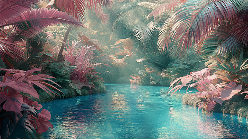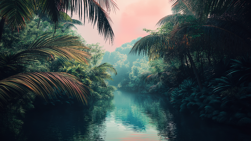 Vollständige Details anzeigenTapete tropische Landschaft | Ruhiger Fluss umgeben von Palmen unter einem pastellrosa Himmel